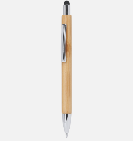 Bolígrafo línea eco con cuerpo de bambú, puntero táctil de color y clip metálico. Pulsador, clip y punta plateados. Carga jumbo transparente de 1,0 mm con tinta azul.