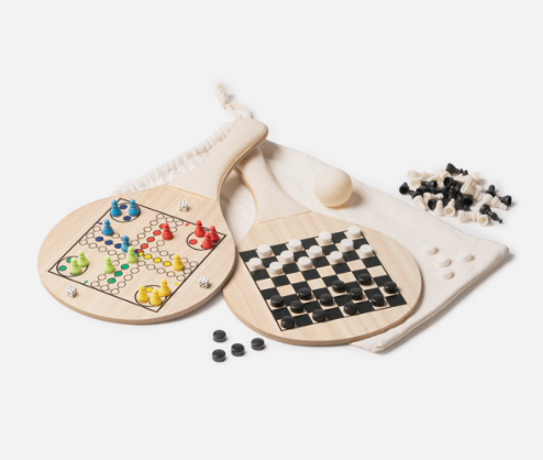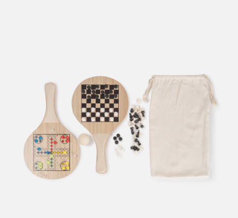Juego de palas de playa realizadas en madera y fibra de trigo. Integra en su superficie diferentes multijuegos: ajedrez y parchís, incluyendo las piezas de juego. Son una opción versátil y práctica, ya que te permite jugar a las palas de forma convencional o a los clásicos juegos de mesa.