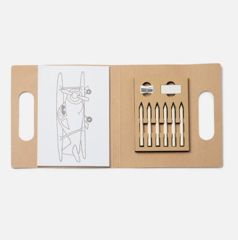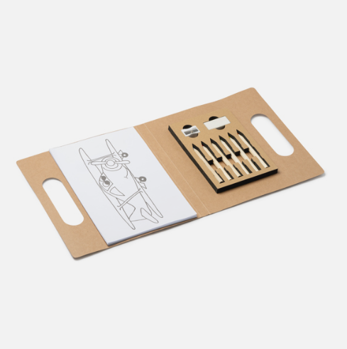 Divertido set infantil para colorear en cualquier lugar, compuesto de 20 hojas con 10 diseños diferentes. Incluye bloc con dibujos variados, 6 lápices de colores, sacapuntas y goma de borrar.